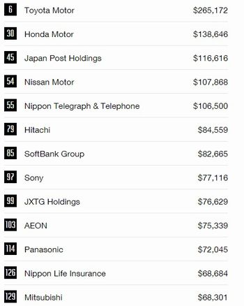 500社を国別で見ると首位の米国が126社と前年より6社減った一方、2位の中国が前年から2社増えて111社、3位の日本は1社増えて52社だった。トヨタ以外の日本勢はホンダが30位、日本郵政が45位、日産自動車が54位、NTTが55位などとなった。