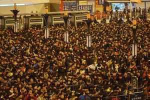 (訳者注:中国の春節の帰省ラッシュを「春運」と呼びます。この期間に長距離移動する旅客の延べ人数は30億人を超えるとも言われます。2016年の春運時の広州駅のセキュリティリスク前の様子の画像です)