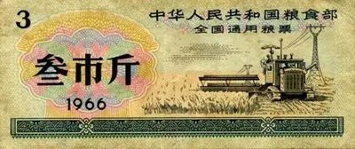 (訳者注:改革開放前の中国は配給制で、食料の購入には配給券(粮票)が必要でした。配給券には使用可能な場所、品物、量が書かれており、実際の食料などの購入のほか、配給券自体が通貨としての役割も担っていました。上が中国全土、食料全般を3斤(1.5kg)交換可能なもの、下が重慶市で肉1斤(500g)と交換可能なもの(肉票)です)