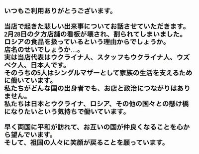 ロシアに対して怒ってくれてる事はありがたいが、ウクライナ人の店の被害ということで・・