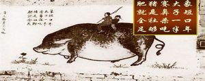 (訳者注: 毛沢東は1958年から1960年にかけて農業・工業の大増産政策である「大躍進運動」を実行し、推計2000万人~5000万人の餓死者を出す結果となりました。このころの地方政府は中央が喜ぶような実体とはかけ離れた報告を行うことが一般的で、その中でも特に優れたものが真偽を問わず人民日報に掲載され、当時の人民日報はネタ帳と化してました。「肥猪赛大象」(ブタを象のように大きく育てた)もその一つで、その他には「畝産万斤」(1畝あたり何万キロの稲を生産した)、「一个萝卜千斤重」(1本500kgの大根の収穫)などがあります)