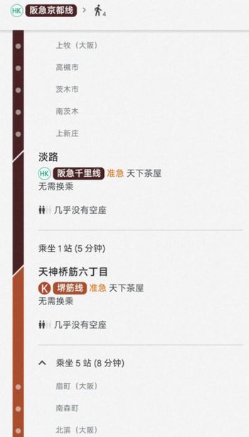 外国人観光客によくある直通電車ネタです。上の画像の淡路と天神橋筋六丁目(天六)の下に書かれている「无需换乘」は「乗換不要」です。