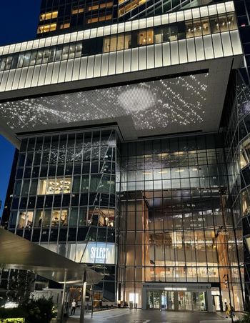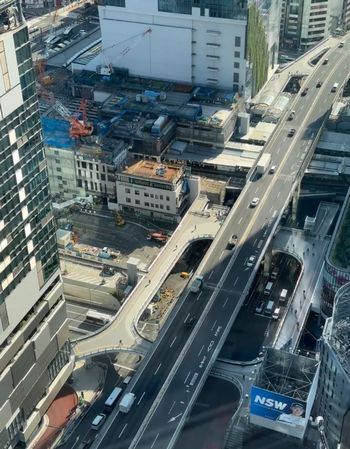 地上、高架道路、地下鉄に加えて、豊富な空中歩道が各建物をつなぎ、複数の空中レベルと屋上公園を創出している。これに対応して、ほぼすべての建物に非常に明確な平面図と断面図の案内が存在する