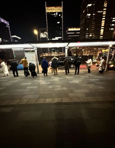 寒風が吹く夜でも、高齢者の方々が長い列を作ってバスを待ち、前後間隔を1メートルずつ保っている。