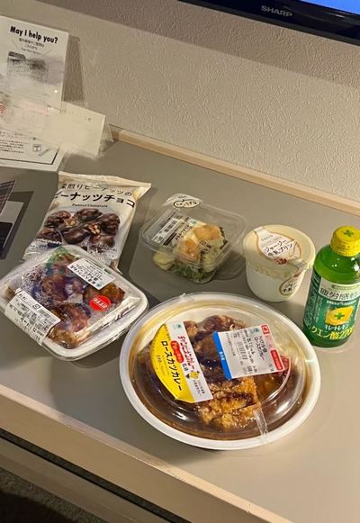 お風呂から上がり、日本の地元のテレビを見ながらファミリーマートで買ったお弁当を食べる。(写真のピーナッツチョコレート、すごく美味しい)