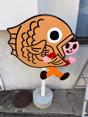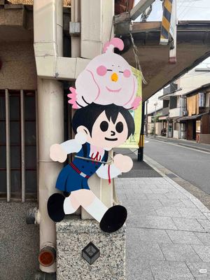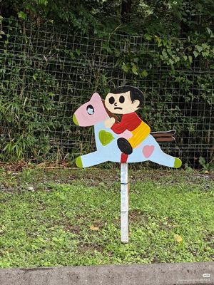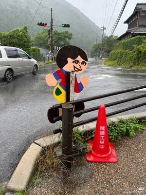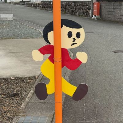 今日、琵琶湖のほとり、近江高島でまた「飛び出し坊や」に遭遇した。もともとは交通安全のサインで、1973年に滋賀県で誕生。地元の工芸師・久田泰平さんの制作だという。