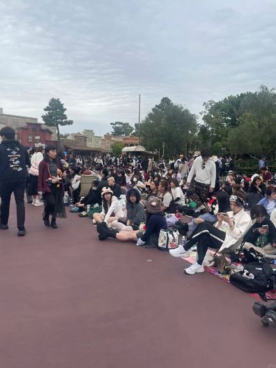 彼らはダラダラしているわけではない。この人たちは「ガチ勢」。朝イチで入園してパレードを見るためにずっとここに座ってる [216 Good]