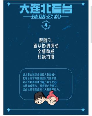(訳者注:「大連北スタンド サポーター公約4:リードに従い、コールの指示に合わせて全力で応援すること。撮影は禁止。北スタンドのサポーターは全力で応援に集中してください。北スタンドには公式の撮影チームとカメラマンがいます。毎試合終了後、公式アカウントを通じてその試合の応援写真や動画などを公開します。そのため、応援中の個人による撮影行為は禁止とします」です)